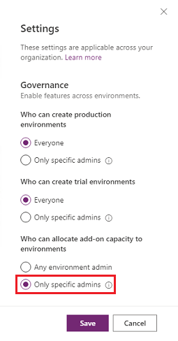 NOTE: We can restrict the people who can allocate the capacity from Power Platform Settings as shown below screen shot