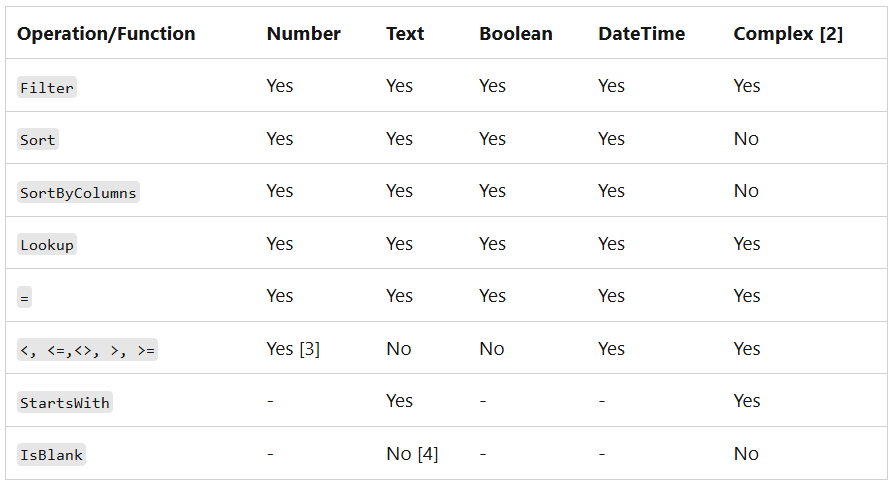 The above table shows supported delegable functions. Understand which function is supported for SharePoint column data type.